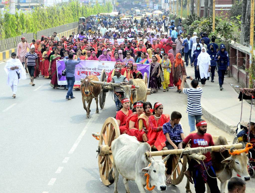 আন্তর্জাতিক নারী দিবসে যশোরে ব্যতিক্রমী গরুর গাড়ির শোভাযাত্রা অনুষ্ঠান অনুষ্ঠিত হয়েছে।