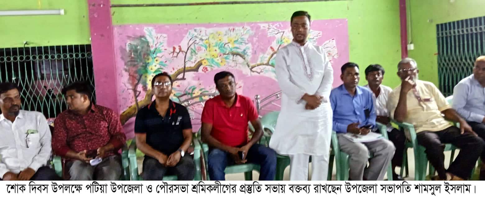 রহিমসহ ইউনিয়ন ও পৌরসভা বিভিন্ন ওয়ার্ডে’র নেতৃবৃন্দ বক্তব্য রাখেন। সভায় বক্তারা আগামী ১৭ আগষ্ট পটিয়া উপজেলা ও পৌরসভার উদ্যোগে জাতীয় শোক দিবসের অনুষ্ঠান সফল করতে সবাইকে ঐক্যবদ্ধ ভাবে কাজ করার আহবান জানান। পটিয়া পৌরসভা শ্রমিকলীগ সভাপতি শফিকুল ইসলাম শফি বলেন, উপজেলা পৌরসভা সকল ওয়ার্ড ইউনিয়ন কমিটির নেতৃবৃন্দ মিছিল সহকারে উক্ত শাহাদাৎ বার্ষিকী সফল করা আহবান জানান।
