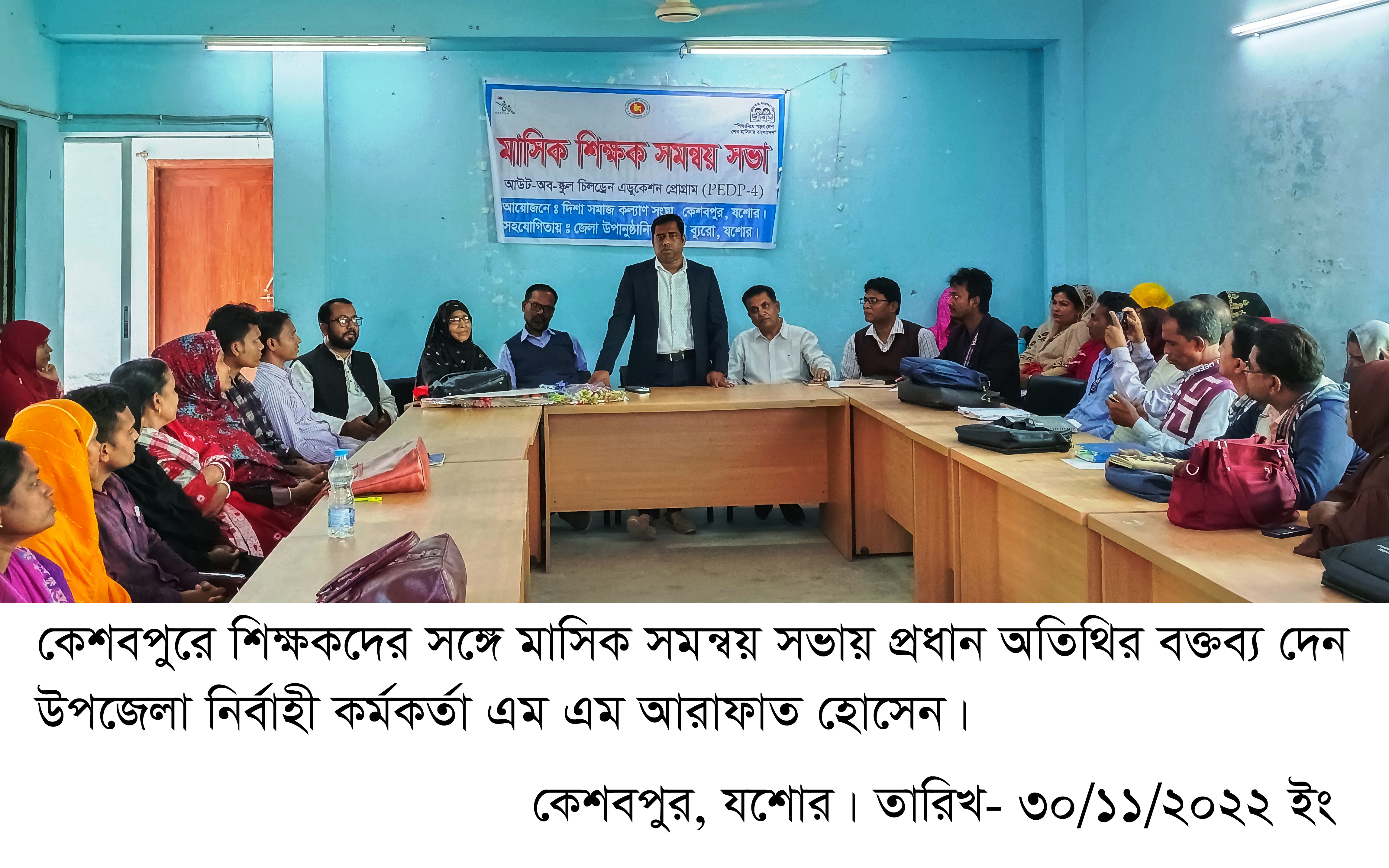 যশোরের কেশবপুরে বুধবার সকালে শিক্ষকদের সঙ্গে মাসিক সমন্বয় সভা অনুষ্ঠিত হয়েছে। দিশা সমাজ কল্যাণ সংস্থার আয়োজনে ও যশোর জেলা উপানুষ্ঠানিক শিক্ষা ব্যুরোর সহযোগিতায় উপজেলা ক্রীড়া সংস্থার হলরুমে এ সভা অনুষ্ঠিত হয়।