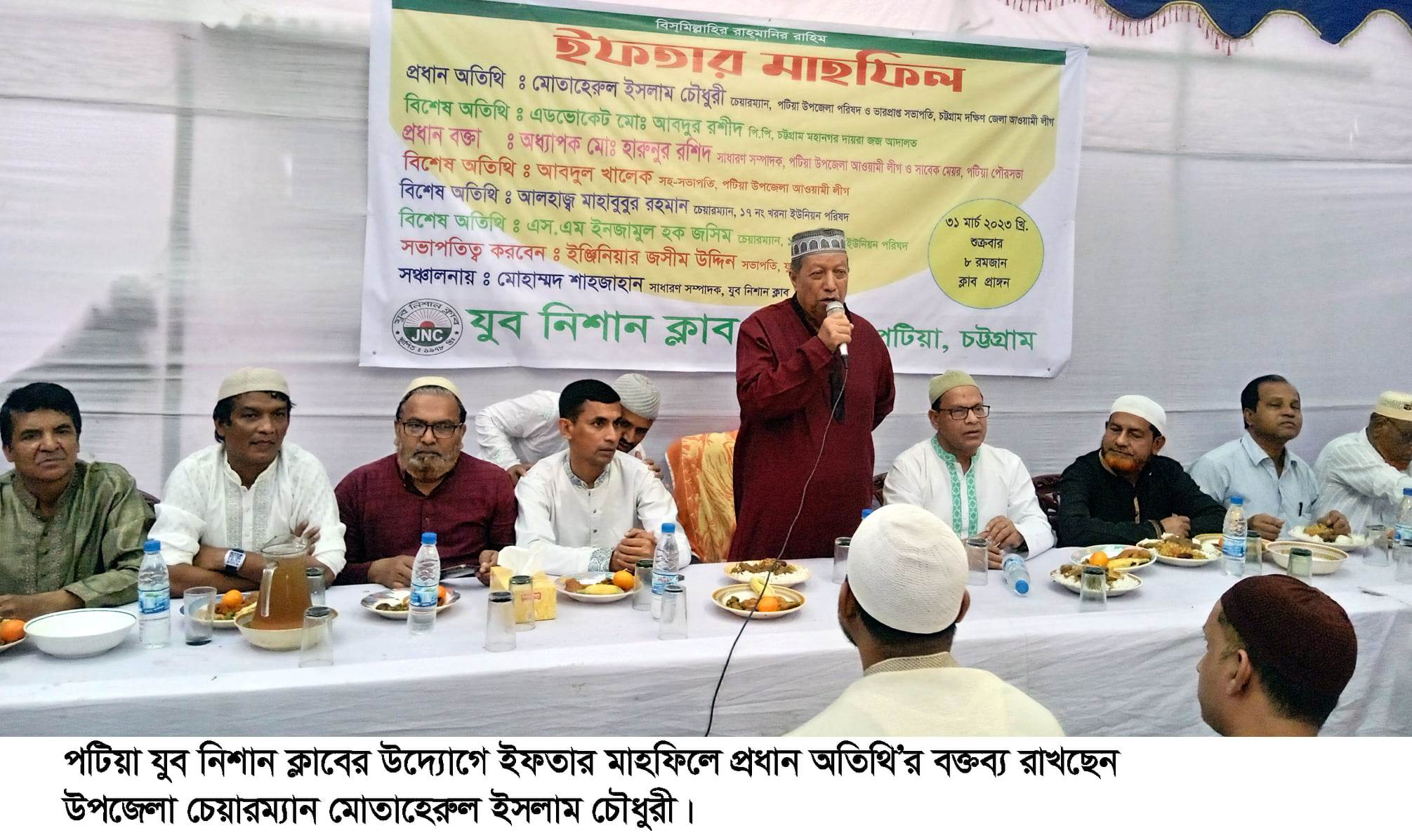 চট্টগ্রাম দক্ষিণ জেলা আওয়ামীলীগ ভারপ্রাপ্ত সভাপতি ও পটিয়া উপজেলা চেয়ারম্যান আলহাজ্ব মোতাহেরুল ইসলাম চৌধুরী বলেছেন, রমজান মাস সিয়াম সাধনা ও তাকওয়ার অর্জনের মাস, কল্যাণ ও বরকতের মাস, রহমত ও মাগফিরাত এবং জাহান্নামের অগ্নি থেকে মুক্তি লাভের মাস। মহান আল্লাহ এ মাসটিকে বহু ফজিলত ও মর্যাদা দিয়ে অভিষিক্ত করেছেন। মাহে রমজান মুমিনদের আত্মগঠন ও প্রশিক্ষণের জন্য এক অনন্য সেরা মাস। তিনি ৩১ মার্চ শুক্রবার শুক্রবার বিকেলে পটিয়ার চক্রশালা এলাকায় সামাজিক, সাংস্কৃতিক ও ক্রীড়া প্রতিষ্ঠান যুব নিশান ক্লাবের উদ্যোগে মাহে রমজান শীর্ষক আলোচনা সভা ও ইফতার মাহফিলে প্রধান অতিথি’র বক্তব্যে এ কথা বলেন। যুব নিশান ক্লাবের সভাপতি ইঞ্জিনিয়ার জসিম উদ্দিনের সভাপতিত্বে ও সাধারন সম্পাদক মোহাম্মদ শাহজাহান পরিচলনায় এতে বিশেষ অতিথি ছিলেন চট্টগ্রাম মহানগর দায়রা জজ আদালতে পিপি এডভোকেট আবদুর রশিদ। প্রধান বক্তা ছিলেন পটিয়া উপজেলা আওয়ামীলীগ সাধারন সম্পাদক সাবেক পৌর মেয়র অধ্যাপক হারুনুর রশিদ। বক্তব্য রাখেন উপজেলা আওয়ামীলীগ সিনিয়র সহ-সভাপতি আবদুল খালেক, খরনা ইউপি চেয়ারম্যান মাহাবুবুর রহমান, কচুয়াই ইউপি চেয়ারম্যান এসএম ইনজামুল হক জসিম, ডাক্তার সাইফুল ইসলাম, ডাক্তার ইমদাদুল হাসান, মাহবুর রহমান চৌধুরী, নুরুল ইসলাম, গোলাম মোহাম্মদ চৌধুরী, যুবনিশান ক্লাবের সাবেক সভাপতি যথাক্রমে মফিজুর রহমান, মো: ইছাক, দেলোয়র হোসেন, ইছাক, একলাসুর রহমান মোহাম্মদ ইছাক,হাসেম মেম্বার, আবু ইউসুফ, বশির আহমদ, সাবেক সাধারণ সম্পাদক কামরুল হাসান ও হারুনুর রশিদ, মাষ্টার নুরুল হাকিম। উপস্থিত ছিলেন মো: সরোয়ার, কামাল উদ্দিন পারভেজ, এডভোকেট কামাল উদ্দিন, এসএম আমান উল্লাহ আমিরী, মো: শহিদ, রাসেদ, তারেক, রুবেল, মামুন প্রমুখ। ইফতার মাহফিলে মোনাজাত পরিচালনা করেন মৌলানা মাহফুজুর রহমান।