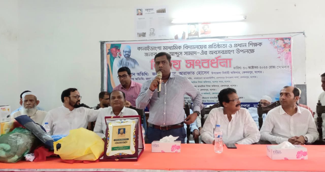 যশোরের কেশবপুর উপজেলার কানাইডাঙ্গা মাধ্যমিক বিদ্যালয়ের প্রতিষ্ঠাতা প্রধান শিক্ষক, সাবেক চেয়ারম্যান মাস্টার আব্দুস সামাদের অবসর জনিত বিদায় সংবর্ধনা অনুষ্ঠান সোমবার (৩০ অক্টোবর) দুপুরে বিদ্যালয়ের হলরুমে অনুষ্ঠিত হয়। কানাইডাঙ্গা মাধ্যমিক বিদ্যালয়ের উদ্যোগে ওই বিদায় সংবর্ধনা অনুষ্ঠানে বিদ্যালয়ের পরিচালনা কমিটির সভাপতি খায়রুজ্জামানের সভাপতিত্বে প্রধান অতিথির বক্তৃতা দেন উপজেলা নির্বাহী অফিসার এম এম আরাফাত হোসেন।