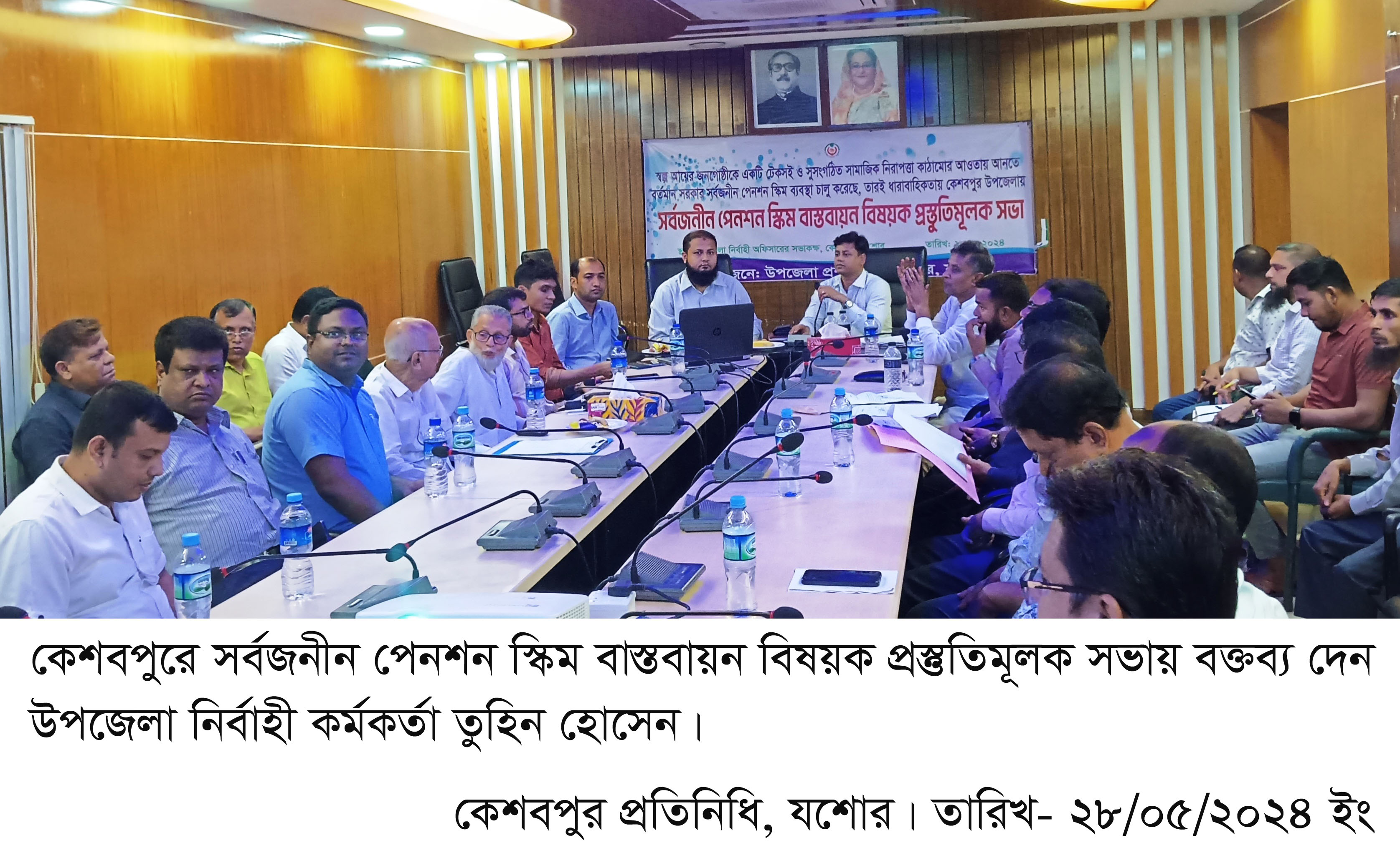 যশোরের কেশবপুরে মঙ্গলবার সকালে সর্বজনীন পেনশন স্কিম বাস্তবায়ন বিষয়ক প্রস্তুতিমূলক সভা অনুষ্ঠিত হয়েছে। স্বল্প আয়ের জনগোষ্ঠীকে একটি টেকসই ও সুসংগঠিত সামাজিক নিরাপত্তা কাঠামোর আওতায় আনতে সরকারের সর্বজনীন পেনশন স্কিম ব্যবস্থা কেশবপুর উপজেলায় বাস্তবায়ন করতে উপজেলা প্রশাসনের উদ্যোগে উপজেলা নির্বাহী কর্মকর্তার সভাকক্ষে ওই সভার আয়োজন করা হয়।